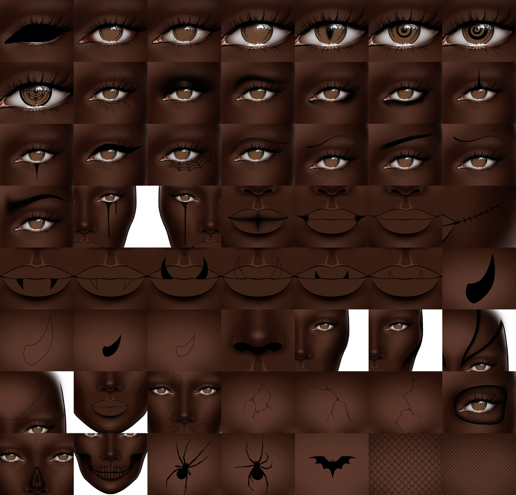 • 3 eyeball, 5 pupil, 4 eyebrow, 4 eyeshadow, 3 eyeliner, 2 eyeliner accent, 3 lip, 6 cross, 4 horn, 2 tear, 1 nose, 2 cheek, forehead mark, 2 robot/cyborg, 4 crack, 3 skull, 2 spider, bat stamp and 2 scale brushes